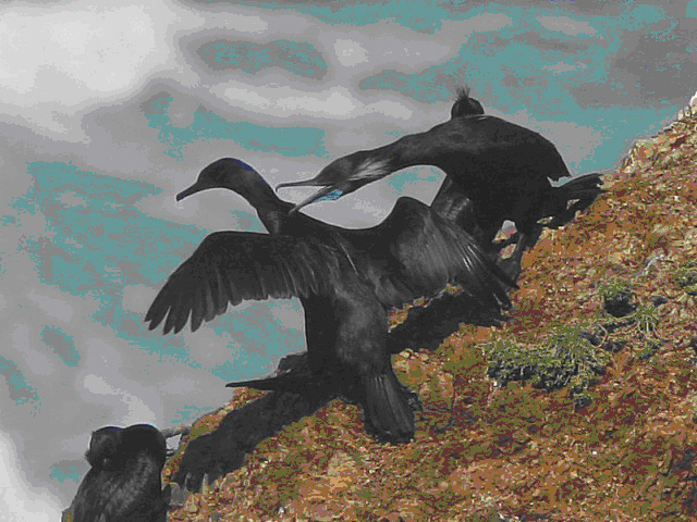 Male cormorants choose the nest site and display there, exhibiting the blue throat pouch. They build a substantial nest on the ground, consisting of dry matter such as grass, sticks or rubbish and seaweed collected by diving, all cemented together by droppings.