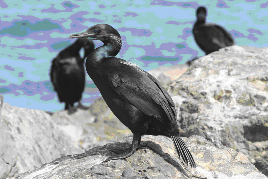 Brandt’s Cormorants inhabit exclusively marine zones including inshore Pacific coastal waters, especially kelp bed areas, as well as large bays, estuaries, or coastal lagoons. They prefer breeding locations on gentle slopes on the windward side of coastal rocks such as the rocks north of Goat Island at the Mendocino Headlands. This species and the Pelagic Cormorant frequently nest on the same cliffs, with Brandt’s forming colonies on level ground at the cliff top and Pelagic choosing inaccessible ledges. Their colonies often include Common Murres, which nest here but so far only roost on coastal Sonoma sea-stacks such as Gualala Point Island. The feisty cormorants provide the murres with protection from marauding gulls.