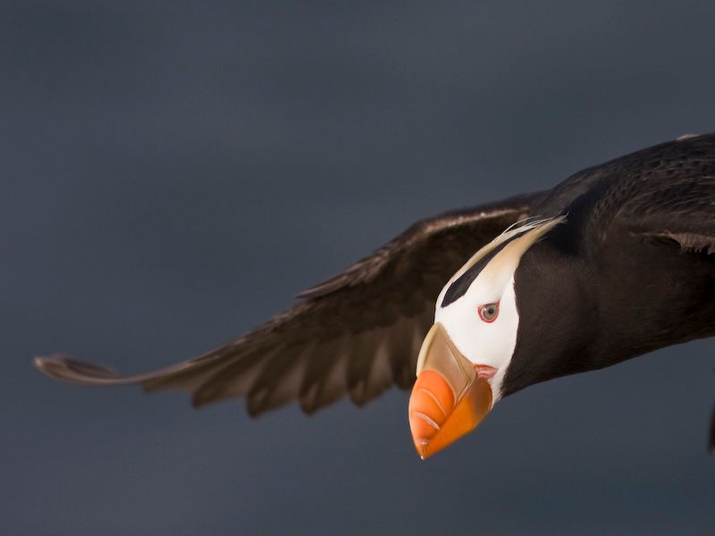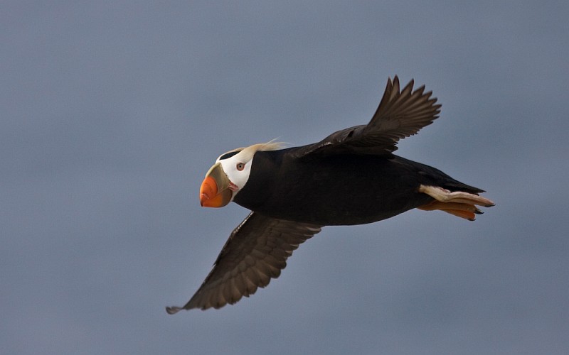 Tufted Puffins weigh nearly twice as much as pigeons, about a pound and a half. Once airborne, they fly well, but these heavy-set birds appear clumsy walking and need a slope and a running start for lift-off. They dive and swim underwater for a half minute or so, using their wings to paddle and their feet to steer their way through schools of small fish, which they catch in their bills. Sometimes a parent puffin will carry a dozen or more fish by using their tongues to hold fish against the spiny palate in their mouth while opening their beak to catch more fish. In flight, they look like flying cigars, moving rapidly and close to the waves.