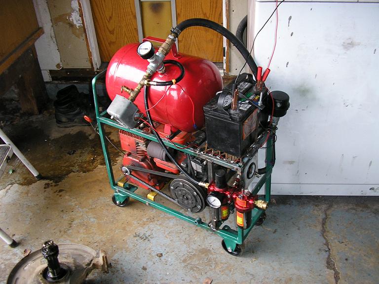 The plumbing, which connects the compressor to the tank, is all regular piping for air compressors that you bought at Orchard Supply. It is mostly ¼ inch pipe, with some ½ inch fittings in the shape of a large cross and attached to the air tank. Since the compressor uses car-air-conditioning-pipe sizes, it has two pieces of hose cut out of a Volvo and hose-clamped onto normal sizes.